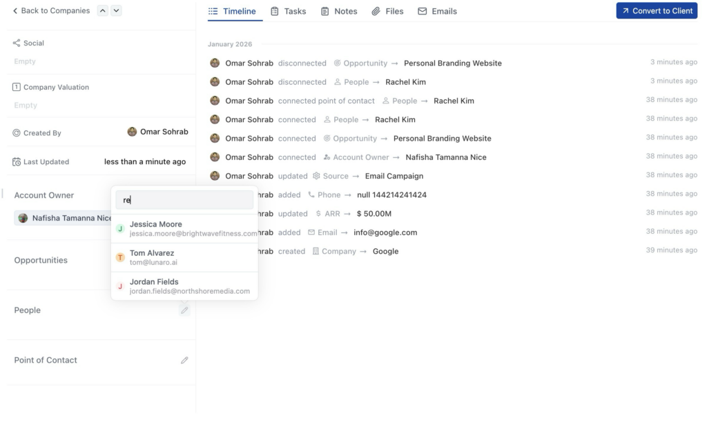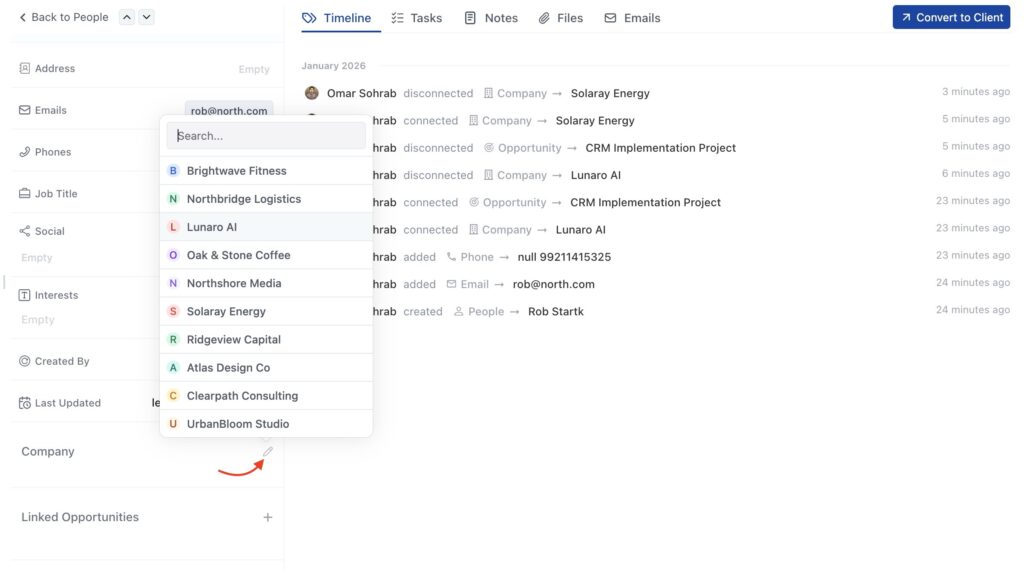 Create a company record when you’re working with a business that has multiple employees. This matters when different people handle different projects at the same organization.