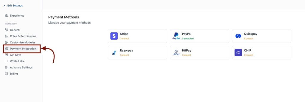 - Click Payment Integration under the Workspace section
