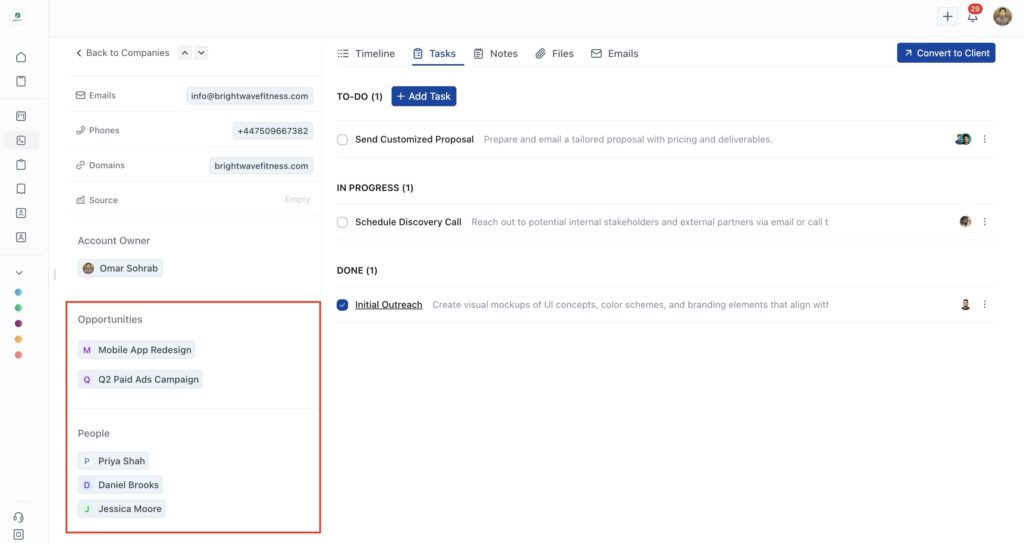 Track the relationship, not just the deal. You’re building a relationship with Brightwave Fitness (the company), not just with individual people. Today you work with Priya. Next month you might work with Daniel on something different.