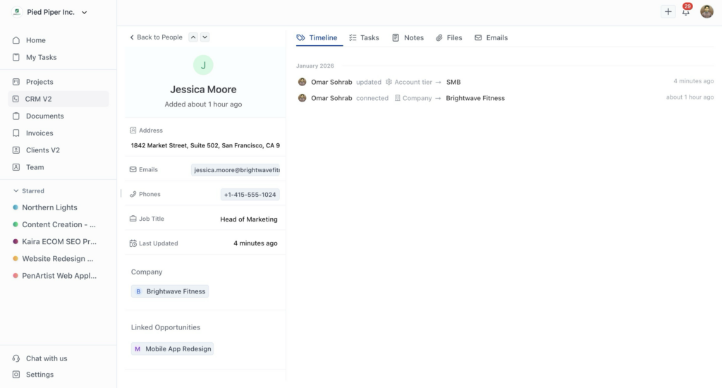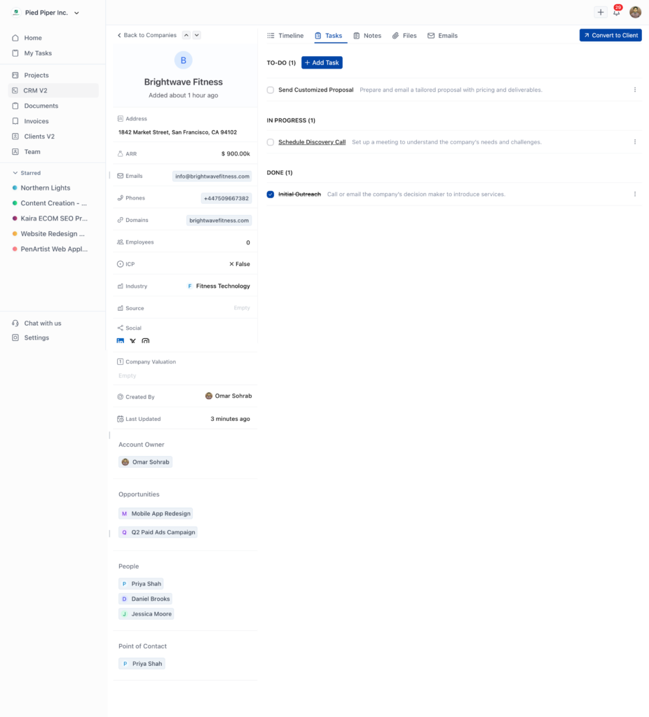 - Opportunities – “Q2 Paid Ads Campaign” with Priya as point of contact, “Mobile App Redesign” with Jessica as point of contact