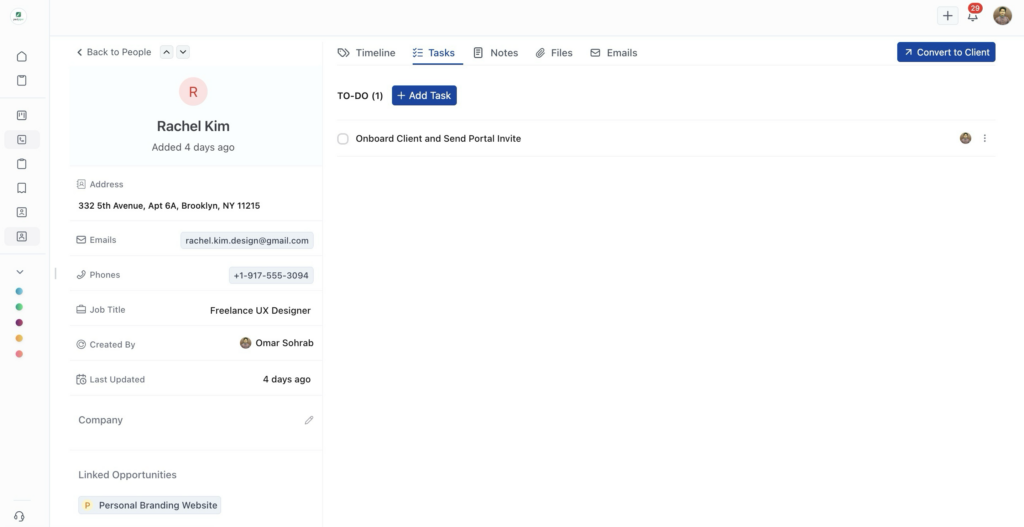 When to create a person: You have an individual contact. They might work at a company or be a solo freelancer. Either way, you need their personal contact information.