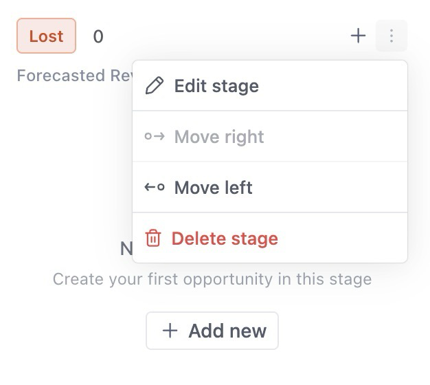 Important: You can only delete empty stages. If the stage has opportunities in it, you must move or delete those opportunities first before deleting the stage.